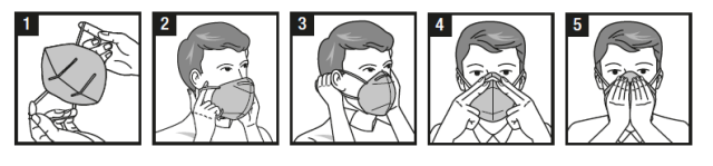5. 使用者必须检查口罩与脸部的密合性: a) 用双手罩住口罩,避免影响口罩在脸上的位置。 b) 如口罩无呼气阀,快速呼气;如口罩带呼气阀,快速吸气。 c) 如空气从鼻梁处泄漏,应按步骤4重新调整鼻夹;如空气从口罩边缘泄漏,应重新调整头带;如不能取得良好的密合,应重复步骤1-4。 d) 如没有感觉泄漏,即为佩戴正确。
