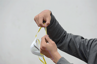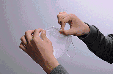 1. 面向口罩无鼻夹的一面,两手各拉住一边耳带,使鼻夹位于口罩上方。
